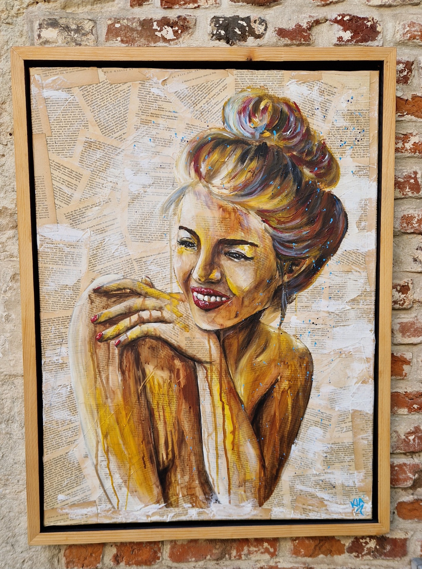 80x60cm, acrylique sur fond de collage sur toile. Cadre fait main.